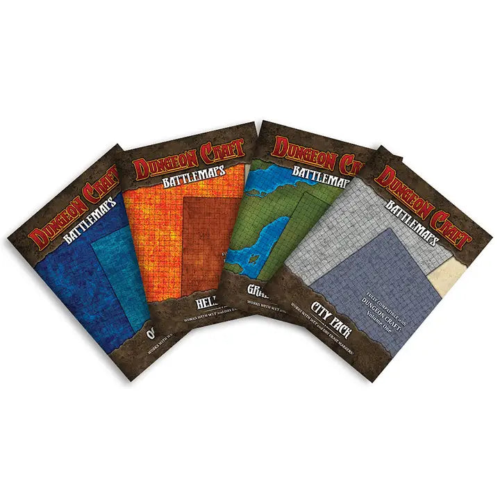 Our Ocean, Hell, Grasslands and City maps all in one pack! -1” squares, the standard for Dungeons & Dragons, Pathfinder and other TTRPGs. -24” x 33”, lots of room for endless encounter building -Works with wet or dry-erase markers -Folds up for easy storage and portability Compatible with Dungeon Craft pieces. Enhance all of your games, making each encounter good looking and memorable.