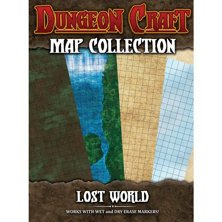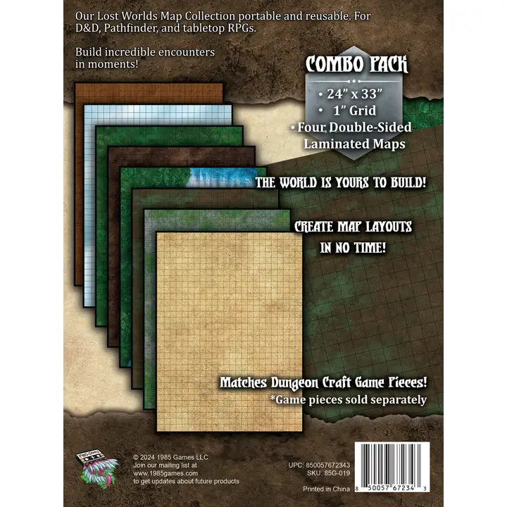 Our Wood/Snow map, jungle City, Jungle Floor and Turned Earth Maps all in one pack! -1” squares, the standard for Dungeons & Dragons, Pathfinder and other TTRPGs. -24” x 33”, lots of room for endless encounter building -Works with wet or dry-erase markers -Folds up for easy storage and portability Compatible with Dungeon Craft pieces. Enhance all of your games, making each encounter good looking and memorable.
